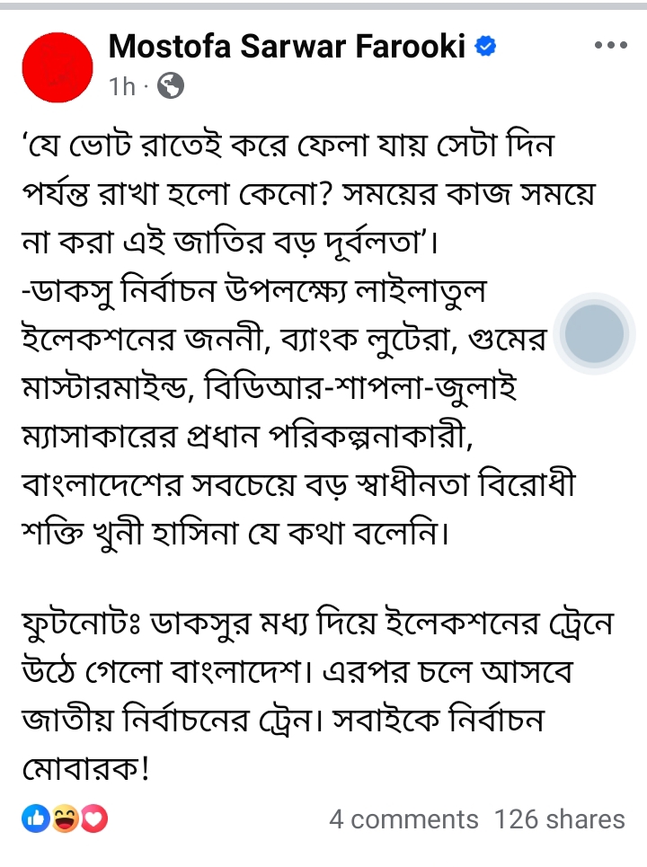 তিনি আরও লিখেছেন, ডাকসু নির্বাচন উপলক্ষে লাইলাতুল ইলেকশনের জননী, ব‍্যাংক লুটেরা, গুমের মাস্টারমাইন্ড, বিডিআর-পিলখানা-জুলাই ম‍্যাসাকারের প্রধান পরিকল্পনাকারী, বাংলাদেশের সবচেয়ে বড় স্বাধীনতাবিরোধী শক্তি খুনি হাসিনা যে কথা বলেনি। সবশেষে ফুটনোট হিসেবে উপদেষ্টা লিখেছেন, ডাকসুর মধ‍্য দিয়ে ইলেকশনের ট্রেনে উঠে গেলো বাংলাদেশ। এরপর চলে আসবে জাতীয় নির্বাচনের ট্রেন। সবাইকে নির্বাচন মোবারক!