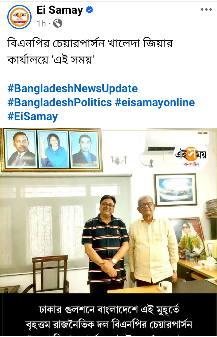 সংবাদটির মূল সেই ছবিটির ক্যাপশনে লেখা হয়, ‘‘ঢাকার গুলশনে বাংলাদেশে এই মুহূর্তে বৃহত্তম রাজনৈতিক দল বিএনপির চেয়ারপার্সন খালেদা জিয়ার কার্যালয়ে ‘এই সময়’। এ মাসের ৪ তারিখে বিএনপির মহাসচিব মির্জা ফখরুল ইসলাম আলমগীরের সঙ্গে অনমিত্র চট্টোপাধ্যায়। নিজস্ব চিত্র।’’