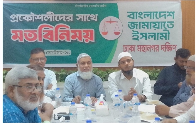 রবিবার ( ২৮ সেপ্টেম্বর) রাতে বাংলাদেশ জামায়াতে ইসলামী ঢাকা মহানগরী দক্ষিণের উদ্যোগে মহানগরী কার্যালয়ের কনফারেন্স রুমে প্রকৌশলীদের সঙ্গে অনুষ্ঠিত মতবিনিময় সভায় প্রধান অতিথির বক্তব্যে তিনি এসব কথা বলেন।