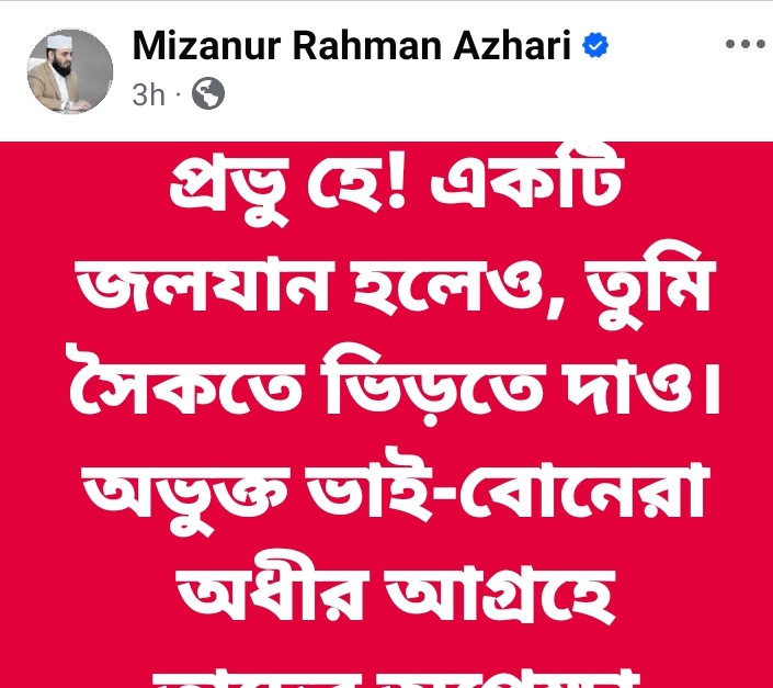 গাজায় মানবিক সাহায্য বহনকারী ফ্লোটিলার যাত্রা নিয়ে একটি আবেগঘন ফেসবুক স্ট্যাটাস দিয়েছেন জনপ্রিয় ইসলামী আলোচক মিজানুর রহমান আজহারি।