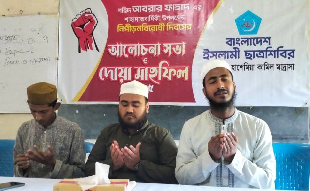 আলোচনা সভায় আরও বক্তৃতা করেন মাদরাসা শাখার বিভিন্ন দায়িত্বশীল নেতৃবৃন্দ। তাঁরা বলেন, নিপীড়নের বিরুদ্ধে কথা বলাই ছিল আবরারের ‘অপরাধ’। এই নির্মম হত্যাকাণ্ড প্রমাণ করে, মতপ্রকাশের স্বাধীনতা আজ হুমকির মুখে। ছাত্রশিবির মনে করে, আবরার হত্যার ন্যায়বিচার নিশ্চিত করা ও নিপীড়নের বিরুদ্ধে জনমত গড়ে তোলা আজ সময়ের দাবি।