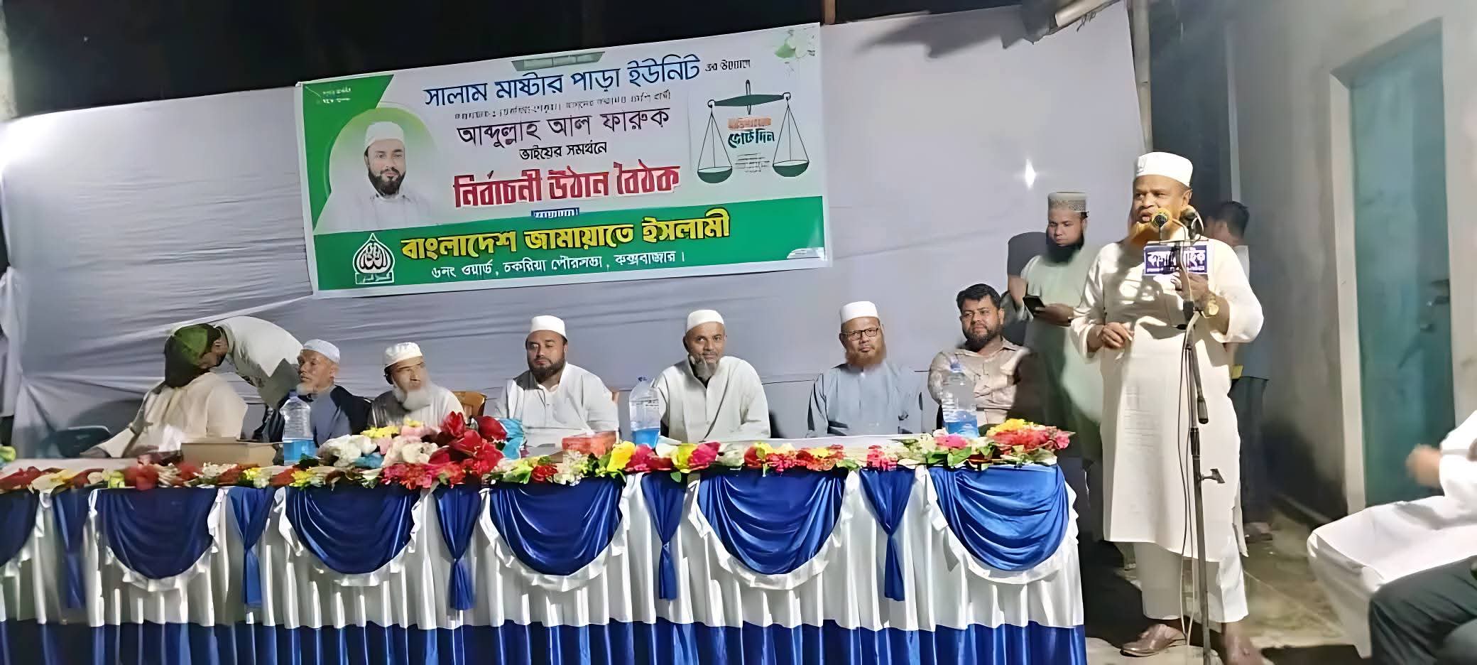 ওয়ার্ড সেক্রেটারি তৌহিদুল ইসলামের সার্বিক তত্ত্বাবধানে ও সহকারী সেক্রেটারি মোহাম্মদ আতিকুর রহমানের সঞ্চালনায় বিশাল উঠান বৈঠকে প্রধান অতিথির বক্তব্য রাখেন জামায়াতে ইসলামী মনোনীত চকরিয়া-পেকুয়া আসনের দাঁড়িপাল্লা মার্কার সংসদ সদস্য পদপ্রার্থী সাবেক ছাত্রনেতা আবদুল্লাহ আল ফারুক।