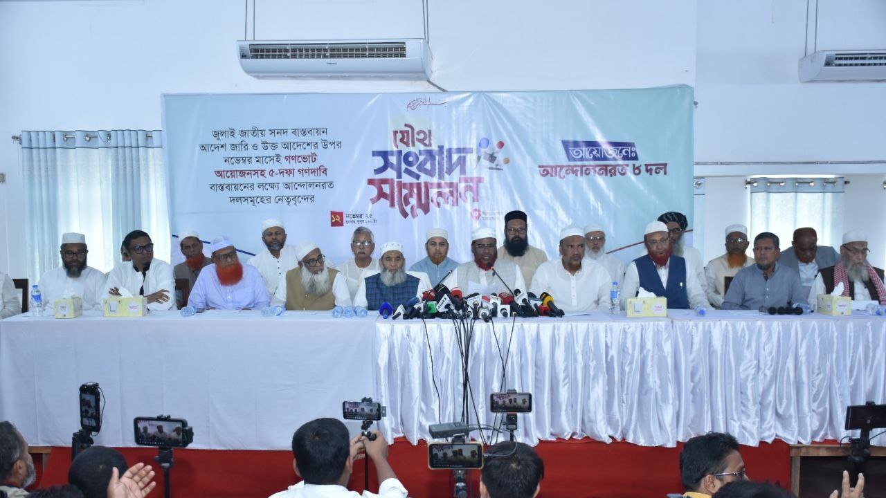 ১২ নভেম্বর (বুধবার) বেলা ১১টায় বাংলাদেশ জামায়াতে ইসলামীর কেন্দ্রীয় কার্যালয়ে আন্দোলনরত ৮ দলের পক্ষ থেকে ‘জুলাই জাতীয় সনদ বাস্তবায়ন আদেশ জারি ও জাতীয় নির্বাচনের পূর্বে গণভোট আয়োজনসহ ৫-দফা গণদাবি বাস্তবায়নের লক্ষ্যে এক যৌথ বৈঠক অনুষ্ঠিত হয়। বৈঠক শেষে মগবাজার আল-ফালাহ মিলনায়তনে বেলা দেড়টায় সাংবাদিকদের উদ্দেশে প্রেস ব্রিফিং করা হয়। ব্রিফিং এর শুরুতেই বাংলাদেশ জামায়াতে ইসলামীর সেক্রেটারি জেনারেল সাবেক এমপি মিয়া গোলাম পরওয়ার আন্দোলনরত ৮ দলের নেতৃবৃন্দ ও উপস্থিত সাংবাদিকদের মুবারকবাদ জানান।