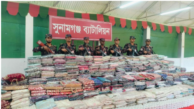 সুনামগঞ্জের সদর উপজেলার মইনপুর এলাকায় টাস্কফোর্সের অভিযানে ভারত থেকে অবৈধ পথে নিয়ে আসা বিপুল পরিমাণ শাড়ি, থ্রী-পিস ও কসমেটিকস জব্দ করেছে বিজিবি। যার আনুমানিক মূল্য ১কোটি ৫৭লাখ ৫৯হাজার টাকা বলে জানিয়েছেন বিজিবি।