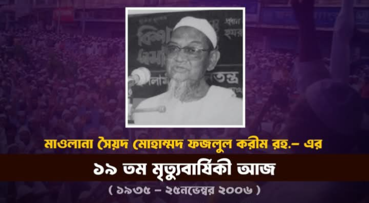 ইসলামী শাসনতন্ত্র আন্দোলন-এর (বর্তমানে ইসলামী আন্দোলন বাংলাদেশ-এর) প্রতিষ্ঠাতা আমীর আপোষহীন ধর্মীয় আধ্যাত্মিক ও রাজনৈতিক নেতা মাওলানা সৈয়দ মোহাম্মাদ ফজলুল করীম- পীরসাহেব চরমোনাই (রহ.)-এর ১৯তম মৃত্যুবার্ষিকী আজ (২৫ নভেম্বর)।