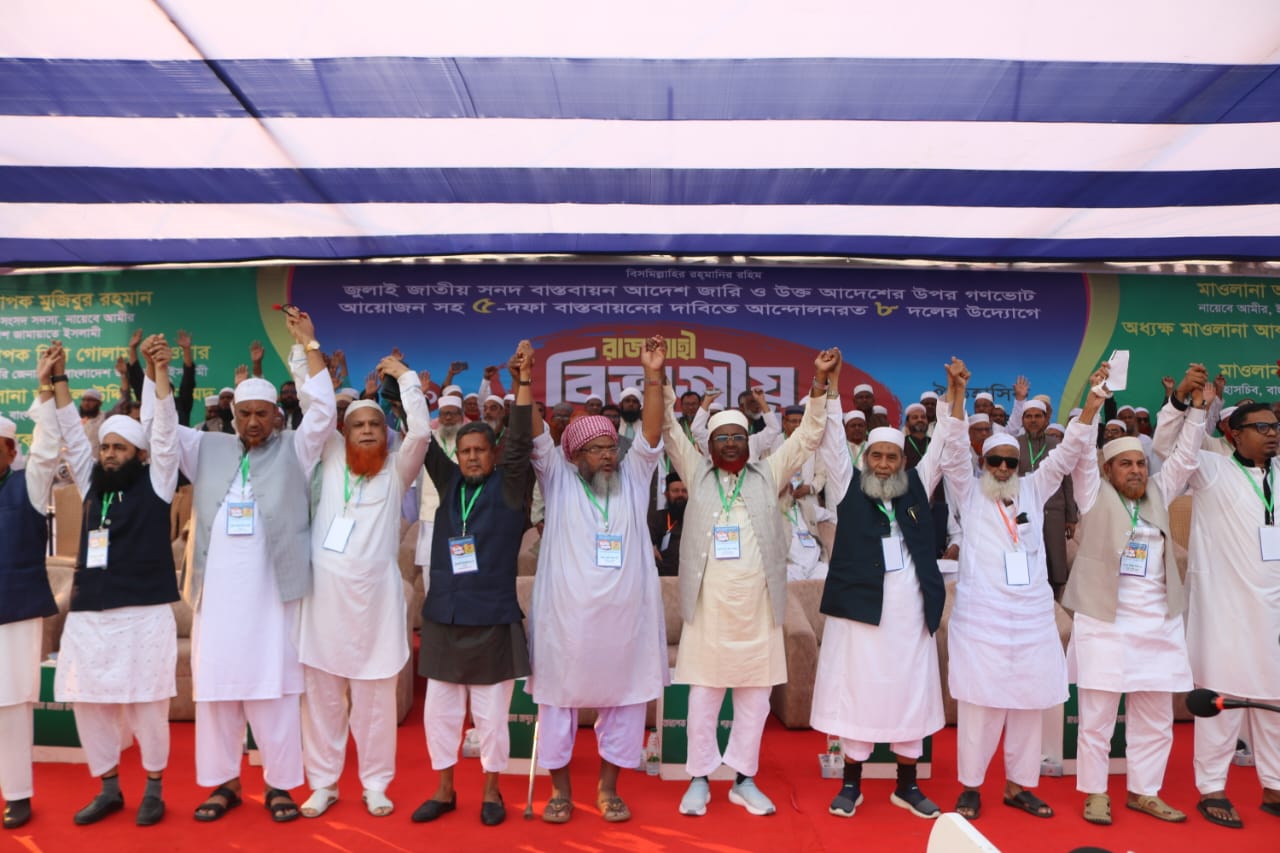 জুলাই জাতীয় সনদ বাস্তবায়ন আদেশ জারি ও উক্ত আদেশের উপর গণভোট আয়োজনসহ ৫ দফা দাবিতে ৮ দলের উদ্যোগে ঐতিহাসিক মাদ্রাসা মাঠে রাজশাহী বিভাগীয় সমাবেশ অনুষ্ঠিত হয়েছে। রোববার (৩০ নভেম্বর) দুপুর ২:০০ টা থেকে ৪:০০ টা পর্যন্ত সমাবেশে বক্তব্য রাখেন ৮ দলের কেন্দ্রীয় নেতৃবৃন্দ।