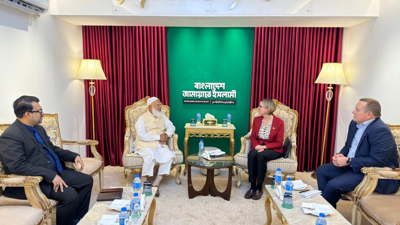 আজ ৪ ডিসেম্বর (বৃহস্পতিবার) সকালে বাংলাদেশ জামায়াতে ইসলামীর আমীর ডা. শফিকুর রহমানের সঙ্গে তাঁর বসুন্ধরার কার্যালয়ে ঢাকাস্থ মান্যবর বৃটিশ হাইকমিশনার মিস সারাহ কুক-এর এক সৌজন্য বৈঠক অনুষ্ঠিত হয়। এ বৈঠকে তাঁর সঙ্গে ছিলেন হাইকমিশনের হেড অব পলিটিক্যাল মি. টিমোথি ডাকেট এবং আমীরে জামায়াতের সাথে উপস্থিত ছিলেন আমীরে জামায়াতের পররাষ্ট্র বিষয়ক উপদেষ্টা প্রফেসর ড. মাহমুদুল হাসান।