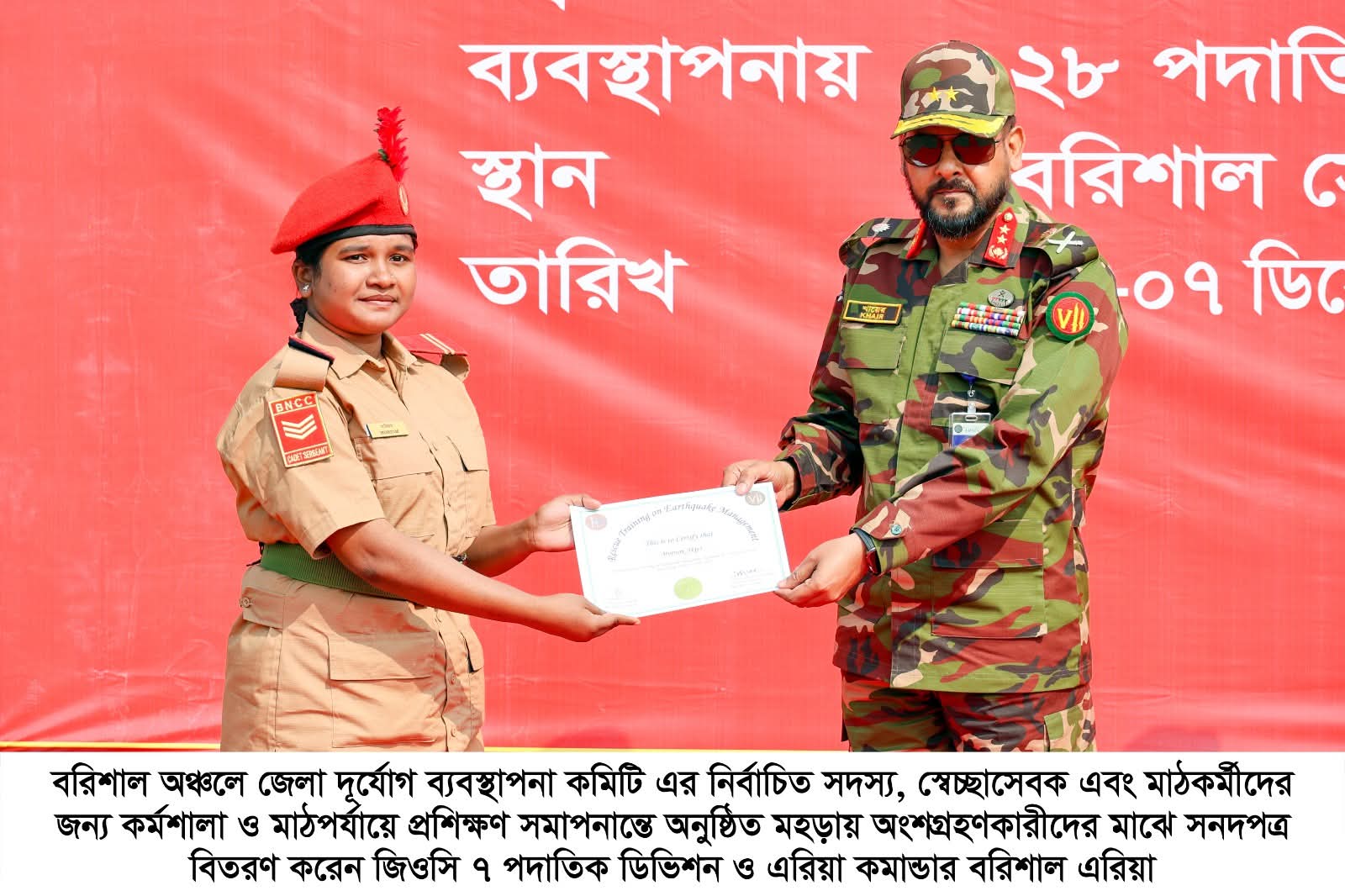 আজ বরিশালে বাংলাদেশ সেনাবাহিনীর ৭ পদাতিক ডিভিশনের তত্ত্বাবধানে জেলা দুর্যোগ ব্যবস্থাপনার উপর একটি সম্মিলিত মহড়ার আয়োজন করা হয়। উক্ত মহড়ায় মেজর জেনারেল এম খায়ের উদ্দীন, এসজিপি, এনডিসি, এএফডব্লিউসি, পিএসসি, জিওসি ৭ পদাতিক ডিভিশন ও এরিয়া কমান্ডার বরিশাল এরিয়া প্রধান অতিথি হিসেবে উপস্থিত থেকে অংশগ্রহণকৃত মাঠ কর্মী, সেচ্ছাসেবক ও ছাত্র-ছাত্রীদের মাঝে সার্টিফিকেট বিতরণ করেন।