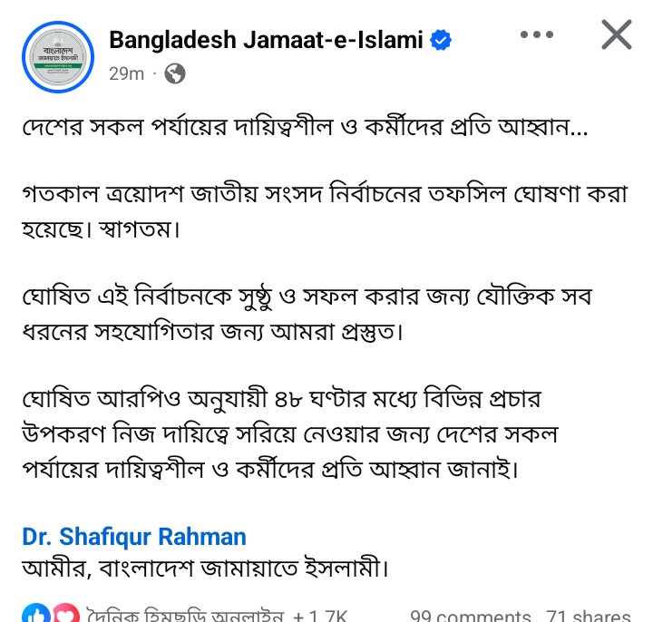 স্টাটাসে আরো বলা ঘোষিত নির্বাচনকে সুষ্ঠু ও যৌক্তিক করতে সকল প্রকার সহযোগিতা করবে জামায়াত।