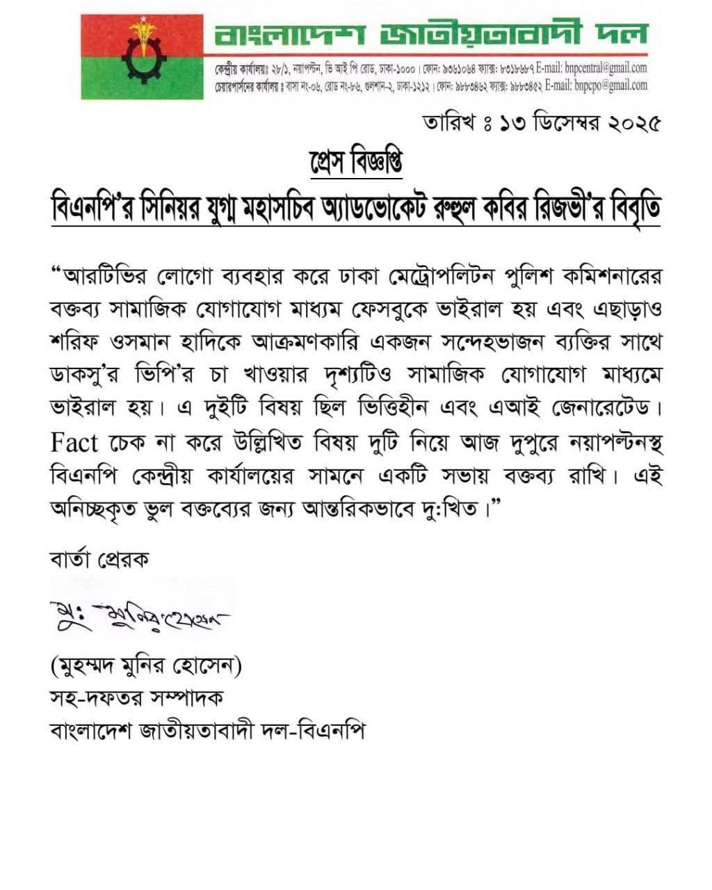 বিএনপির কেন্দ্রীয় দপ্তর থেকে পাঠানো এক বিবৃতিতে রিজভী বলেন, আরটিভির লোগো ব্যবহার করে ঢাকা মেট্রোপলিটন পুলিশ কমিশনারের বক্তব্য সামাজিক যোগাযোগ মাধ্যম ফেসবুকে ভাইরাল হয় এবং এছাড়াও শরিফ ওসমান হাদিকে আক্রমণকারি একজন সন্দেহভাজন ব্যক্তির সঙ্গে ডাকসু’র ভিপি’র চা খাওয়ার দৃশ্যটিও সামাজিক যোগাযোগ মাধ্যমে ভাইরাল হয়। এ দুইটি বিষয় ছিল ভিত্তিহীন এবং এআই জেনারেটেড।Fact চেক না করে উল্লিখিত বিষয় দুটি নিয়ে শনিবার দুপুরে নয়াপল্টনস্থ বিএনপি কেন্দ্রীয় কার্যালয়ের সামনে একটি সভায় বক্তব্য রাখি। এই অনিচ্ছাকৃত ভুল বক্তব্যের জন্য আন্তরিকভাবে দু:খিত।