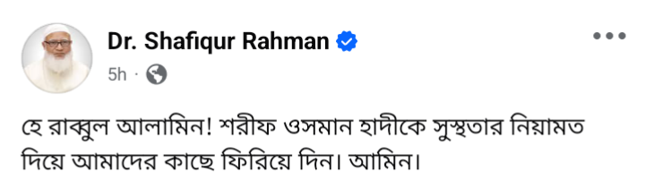 সোমবার বিকেলে তিনি বলেন, হে রাব্বুল আলামিন! শরীফ ওসমান হাদীকে সুস্থতার নিয়ামত দিয়ে আমাদের কাছে ফিরিয়ে দিন। আমিন।
