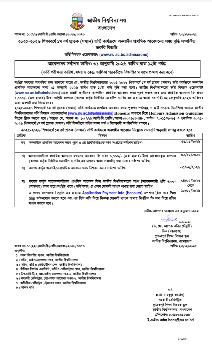 জাতীয় বিশ্ববিদ্যালয়ের অধিভুক্ত স্নাতক (সম্মান) শ্রেণিতে পাঠদানকারী কলেজগুলোতে ২০২৫-২৬ শিক্ষাবর্ষে প্রথম বর্ষ স্নাতক (সম্মান) শ্রেণিতে ভর্তিতে প্রাথমিক আবেদনের সময় বৃদ্ধি করা হয়েছে। নতুন সূচি অনুযায়ী অনলাইনে শিক্ষার্থীরা আবেদন করতে পারবেন ৩১ জানুয়ারি দিবাগত রাত ১২টা পর্যন্ত। আগ্রহী প্রার্থীকে জাতীয় বিশ্ববিদ্যালয়ের ভর্তিবিষয়ক ওয়েবসাইট থেকে আবেদন ফরম পূরণ করতে হবে। আবেদনের অন্য সব শর্ত অপরিবর্তিত থাকবে বলে জাতীয় বিশ্ববিদ্যালয়ের এক বিজ্ঞপ্তিতে বলা হয়েছে। ভর্তি পরীক্ষার সময় ও কেন্দ্রের তালিকা পরবর্তী সময়ে প্রকাশ করা হবে।