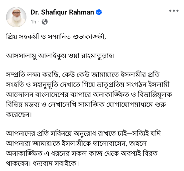 পোস্টে জামায়াত আমির লেখেন—প্রিয় সহকর্মী ও সম্মানিত শুভাকাঙ্ক্ষী, আসসালামু আলাইকুম ওয়া রাহমাতুল্লাহ। সম্প্রতি লক্ষ করছি, কেউ কেউ জামায়াতে ইসলামীর প্রতি সংহতি ও সহানুভূতি দেখাতে গিয়ে ভ্রাতৃপ্রতিম সংগঠন ইসলামী আন্দোলন বাংলাদেশের ব্যাপারে অনাকাঙ্ক্ষিত ও বিভ্রান্তিমূলক বিভিন্ন মন্তব্য ও লেখালেখি সামাজিক যোগাযোগমাধ্যমে শুরু করেছেন।