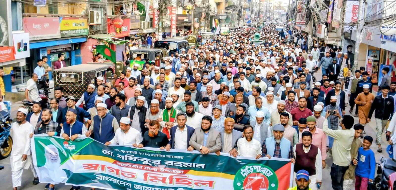 বাংলাদেশ জামায়াতে ইসলামীর আমীর ডা. শফিকুর রহমানের কক্সবাজার আগমনকে কেন্দ্র করে আয়োজিত স্বাগত মিছিলে বিপুল জনসমাগম দেখা গেছে। শহরের প্রধান সড়ক কক্সবাজার হাশেমিয়া মাদ্রাসা হয়ে প্রদক্ষিণ করা মিছিলটি বাহারছড়া গোল চত্বরে এসে একপর্যায়ে বড় ধরনের গণসমাবেশে রূপ নেয়।