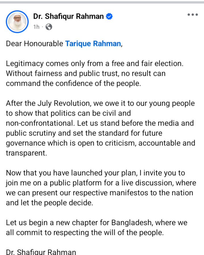 পোস্টে তিনি লিখেন, প্রিয় তারেক রহমান, সুশাসন কেবল নিশ্চিত হতে পারে কেবল একটি অবাধ ও সুষ্ঠু নির্বাচনের মাধ্যমে। ন্যায্যতা ছাড়া কোনো নির্বাচনের ফল জনগণের আস্থা অর্জন করতে পারে না।
