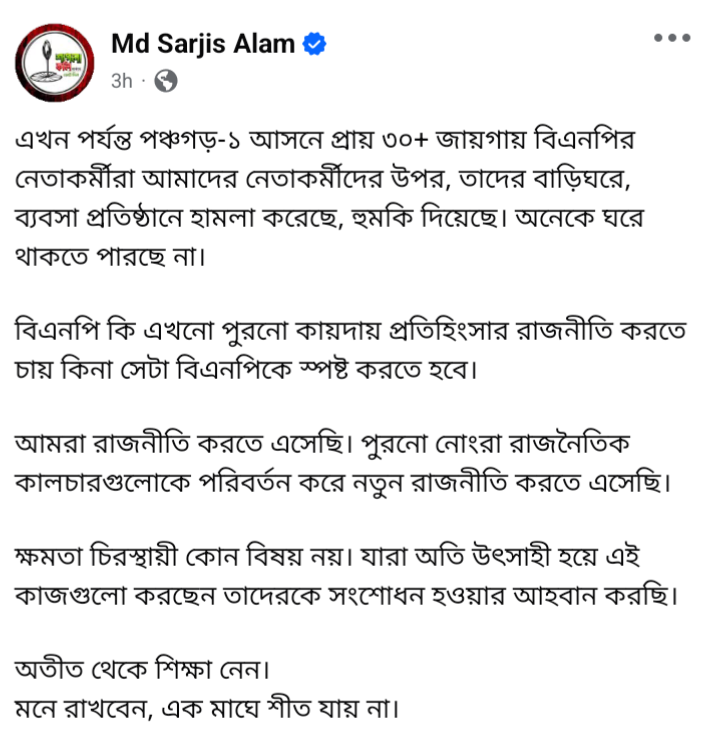 ফেসবুকে সারজিস আলম লেখেন, ‘এখন পর্যন্ত পঞ্চগড়-১ আসনে প্রায় ৩০+ জায়গায় বিএনপির নেতাকর্মীরা আমাদের নেতাকর্মীদের উপর, তাদের বাড়িঘরে, ব্যবসা প্রতিষ্ঠানে হামলা করেছে, হুমকি দিয়েছে। অনেকে পালিয়ে আছে।