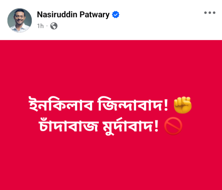 ‘ইনকিলাব জিন্দাবাদ’ স্লোগান ইস্যুতে এবার কড়া বার্তা দিয়েছেন জাতীয় নাগরিক পার্টির (এনসিপি) মুখ্য সমন্বয়ক নাসীরুদ্দীন পাটওয়ারী।