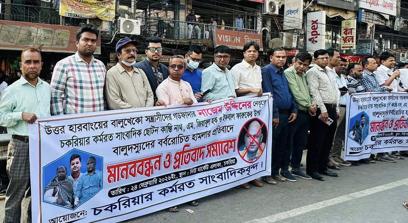 চকরিয়ায় পরিবেশ বিধ্বংসী বালুদস্যু কর্তৃক উপজেলায় কর্মরত তিন সাংবাদিকের ওপর ন্যাক্কারজনক হামলার প্রতিবাদে মানববন্ধন কর্মসূচি অনুষ্ঠিত হয়েছে।