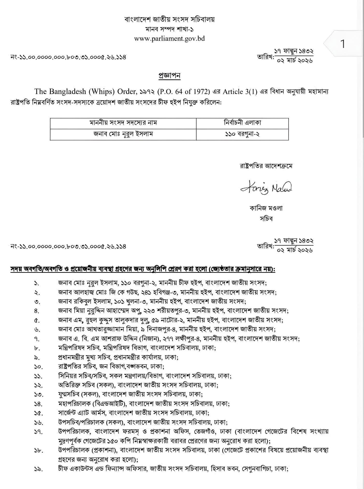 মহামান্য রাষ্ট্রপতি ত্রয়োদশ জাতীয় সংসদের চীফ হুইপ ও হুইপ হিসেবে নিম্নোক্ত মাননীয় সংসদ সদস্যগণকে নিয়োগ প্রদান করেছেন।