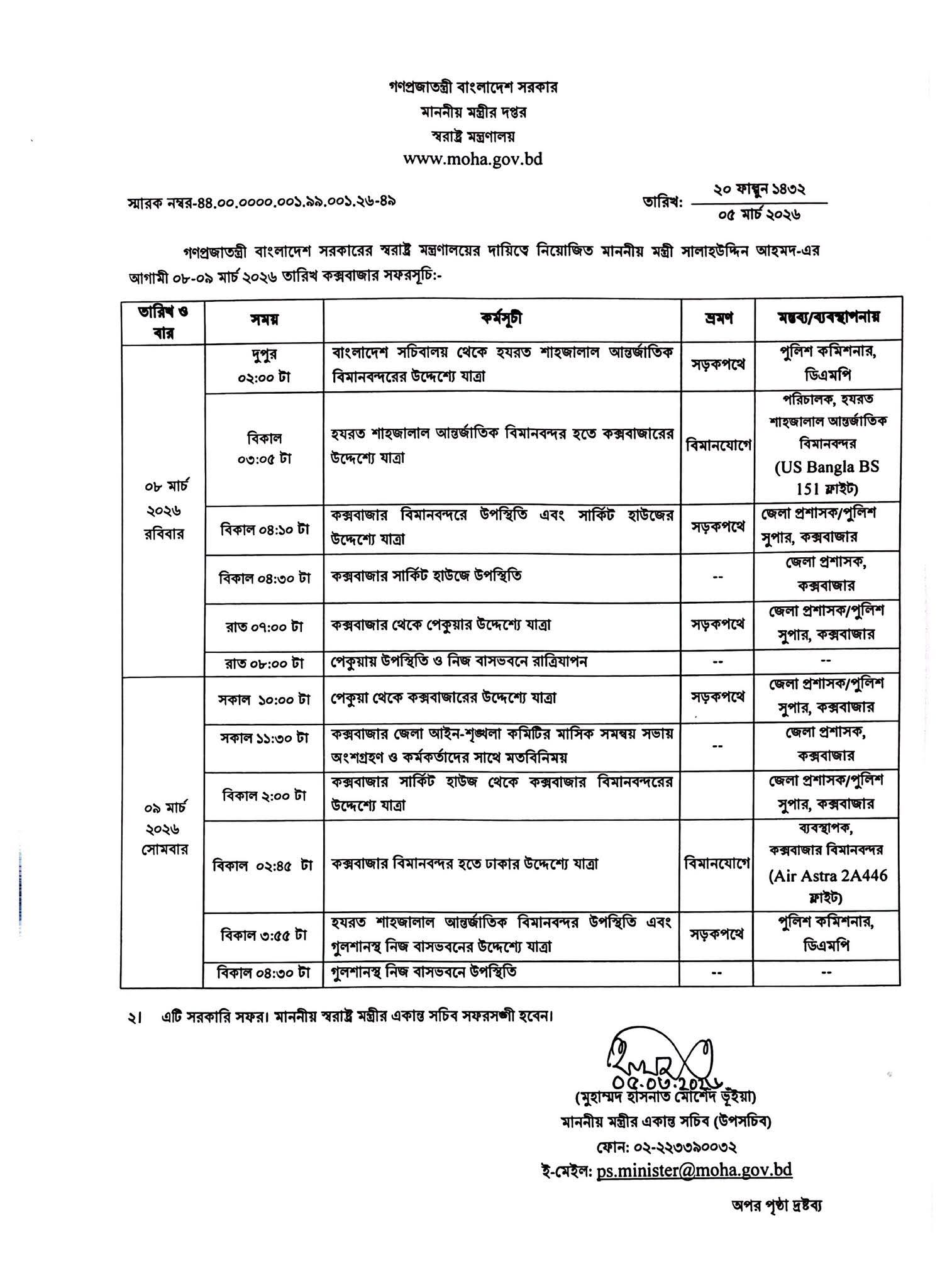 মন্ত্রীর একান্ত সচিব মুহাম্মদ হাসনাত মোর্শেদ ভুঁইয়া স্বাক্ষরিত সফরসূচিতে জানানো হয়, এটি স্বরাষ্ট্রমন্ত্রীর সরকারি সফর।