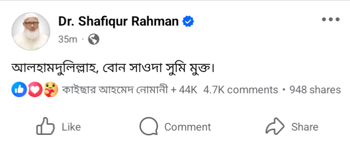 বিষয়টি নিশ্চিত করেছেন বাংলাদেশ জামায়াতে ইসলামীর আমির ডা. শফিকুর রহমান। তিনি ফেসবুক পোস্টে বলেন, ‘আলহামদুলিল্লাহ, বোন সাওদা সুমি মুক্ত।