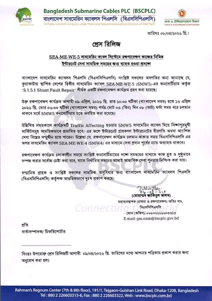 আজ বুধবার পাঠানো সংবাদ বিজ্ঞপ্তিতে বিএসসিপিএলসি বলেছে, ৯ এপ্রিল রাত ১০টা থেকে ১৩ এপ্রিল ভোর ৬টা পর্যন্ত রক্ষণাবেক্ষণকাজ চলাকালে সিঙ্গাপুরমুখী সার্কিটগুলো সাময়িকভাবে প্রভাবিত হবে। এর ফলে দেশে ইন্টারনেটের ধীরগতি বা সেবা আংশিক বিঘ্ন ঘটতে পারে।