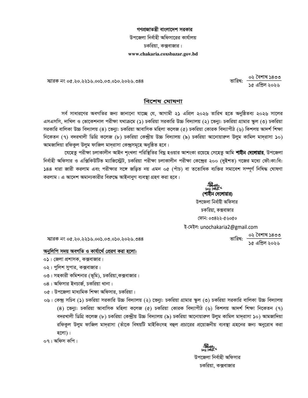 চকরিয়া উপজেলা নির্বাহী কর্মকর্তা (ইউএনও) স্বাক্ষরিত এক আদেশে জানানো হয়েছে যে, পরীক্ষার দিনগুলোতে কেন্দ্রসমূহের নির্ধারিত সীমানার মধ্যে জনসমাগম ও বিশৃঙ্খলা রোধে এই নিষেধাজ্ঞা বলবৎ থাকবে।
